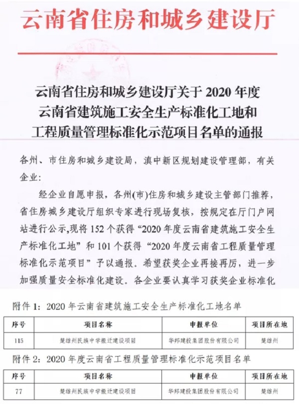 在云南,由乐动平台承建的楚雄州民族中学搬迁建设项目获省州级“2020年度建筑施工安全生产标准化工地”、“2020年度建筑工程质量管理标准化示范项目”。此次获评充分展现了乐动(中国)乐动(中国)在房建领域的建设实力,也是对乐动(中国)乐动(中国)先进管理经验的充分肯定。