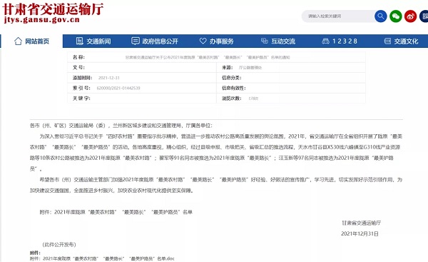 近期,甘肃省交通运输厅公布2021年度陇原“最美农村路”“最美路长”“最美护路员”名单,其中由乐动平台承建的白银市白银区蒋家湾四村沿河乡村旅游公路荣获2021年度陇原“最美农村路”称号。