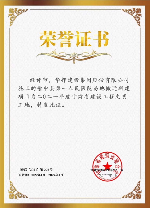 2022年1月,从甘肃省建筑业联合会传来喜讯,经相关专家组评审,榆中医院项目荣获2021年度“甘肃省建设工程文明工地”称号,这是对榆中医院项目安全管理、文明施工的肯定,也是对乐动(中国)乐动(中国)建设能力的高度认可。